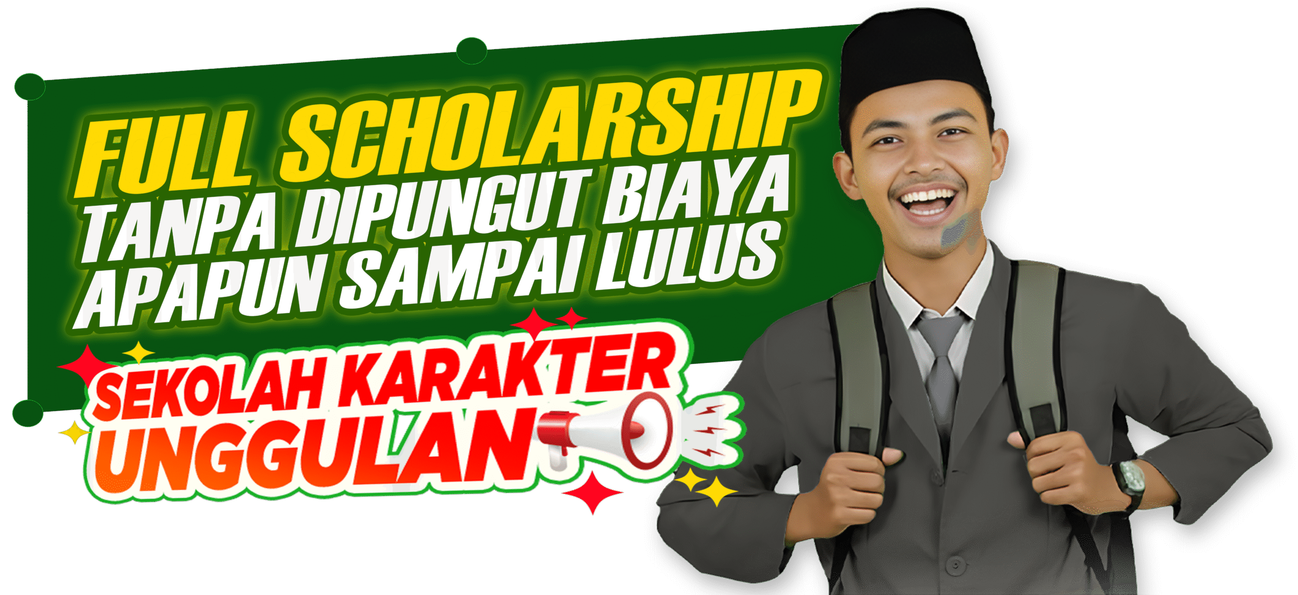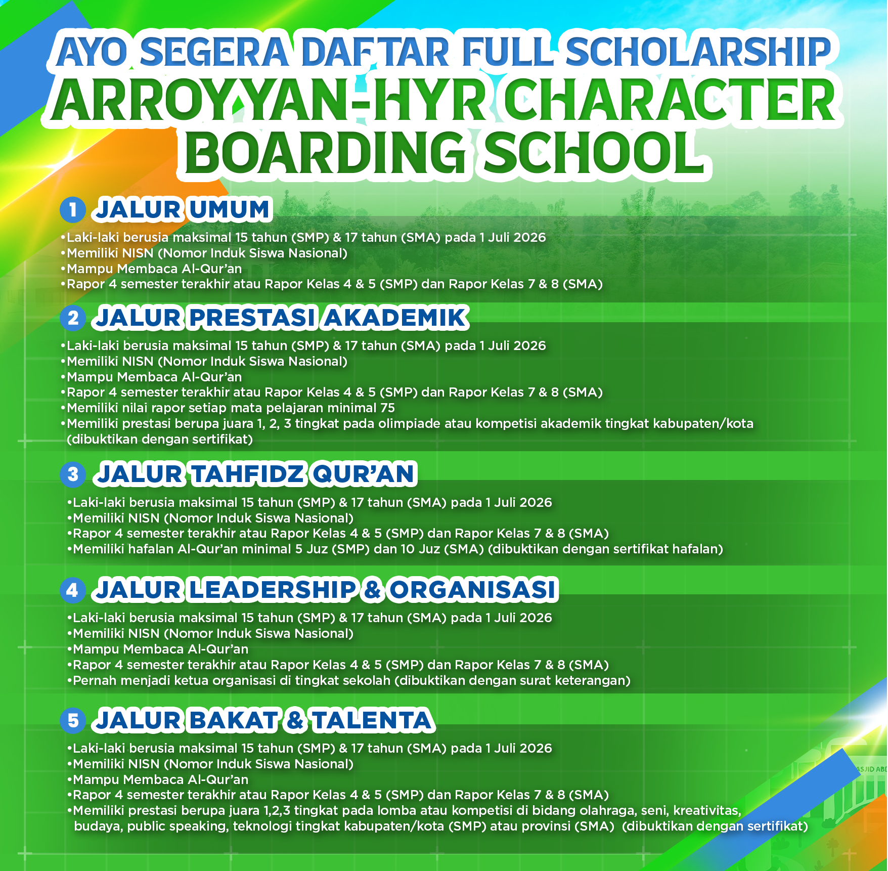 Kamu bisa mendapatkan banyak beasiswa di Arroyyan-HYR Character Boarding School meliputi Biaya Pendidikan Penuh Sampai Lulus, Tinggal di Asrama Modern dan Nyaman, Makan Sehat Bergizi 3 kali sehari, Perlengkapan Sekolah Komplet, Layanan Laundry Pakaian dan Layanan Kesehatan Terpadu.