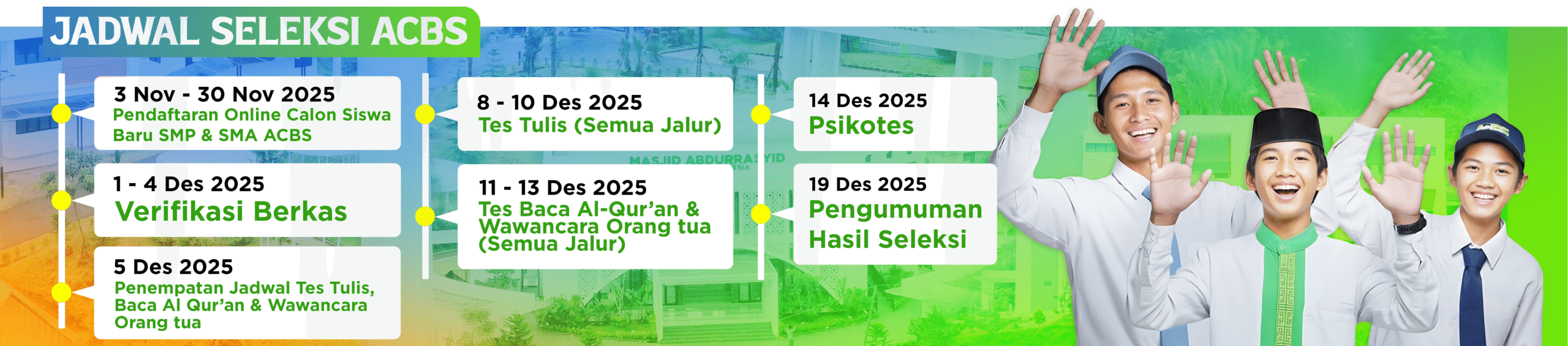 ACBS memberikan beasiswa full sampai lulus dengan pendidikan berstandar internasional yang memadukan kekuatan pada kecerdasan intelektual (akademik), spiritual (akhlak), dan emosional (soft skill).